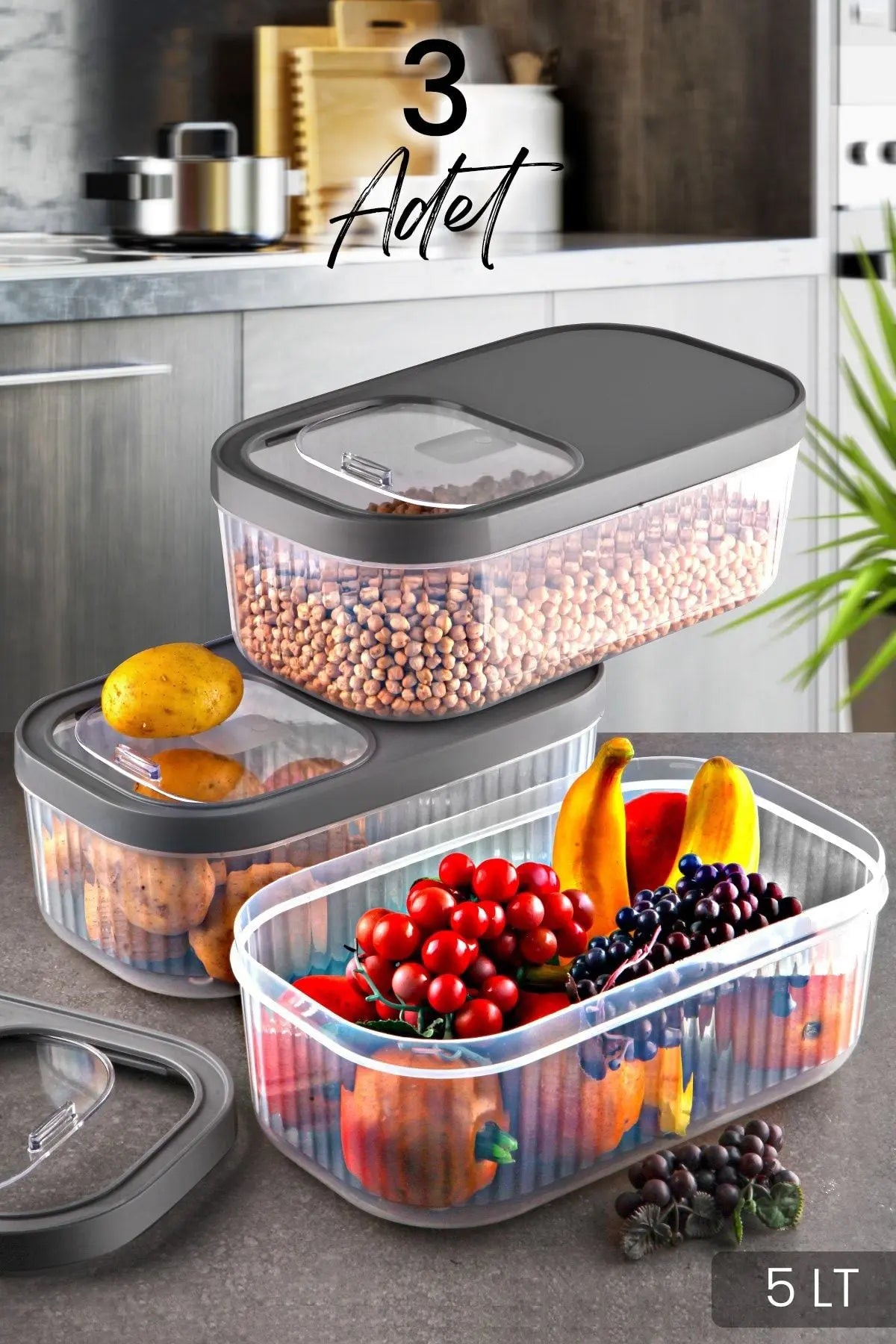Kitchen Life 3 Pieces Jumbo Size Storage Container with Sliding Lid Made from ultra-durable, flexible, hard #5 PP plastic Thanks to its long (5lt) volume, you can store your detergent tablets, provisions, legumes (Rice and Bulgur), as well as your snacks, nuts and chips, if you wish. It offers very practical use thanks to its sliding cover. Suitable for food contact. Does not contain BPA, does not contain substances that harm health. It is easy to clean. It can be washed in the dishwasher. Package content: 3 pieces of 5 lt Product Dimension Product Dimension 34.5x19x12.5 cm