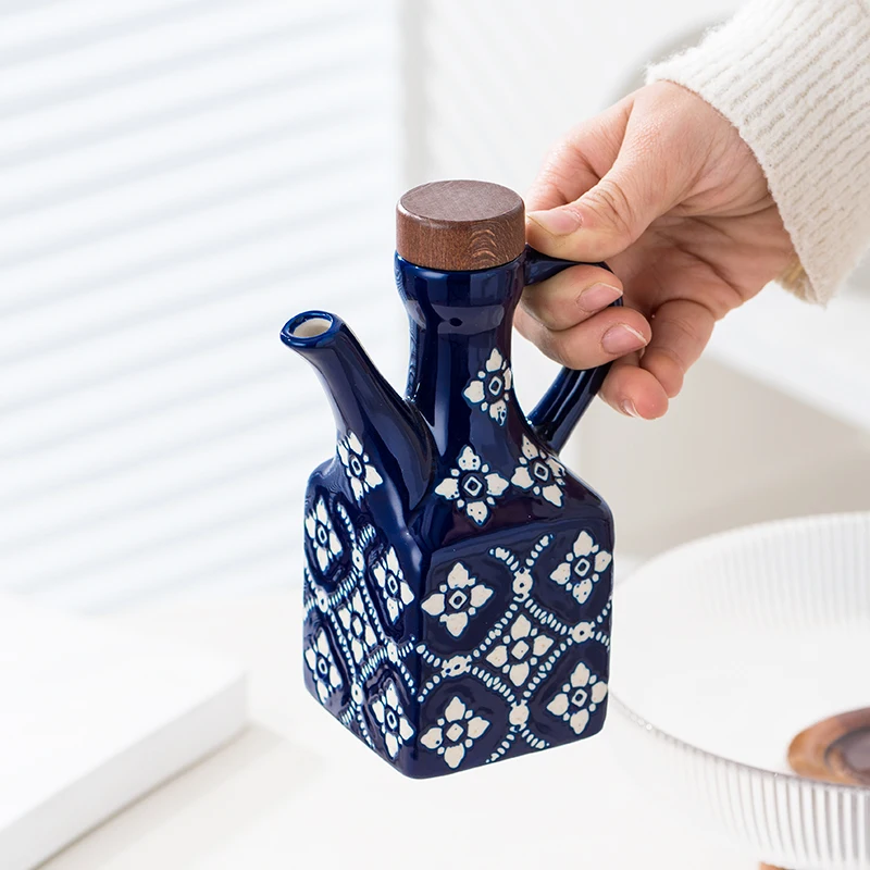 Underglaze Ceramic Oil Pot with Wooden Lid – Blue Flower Design | For Oil, Vinegar, Soy Sauce & Seasonings
